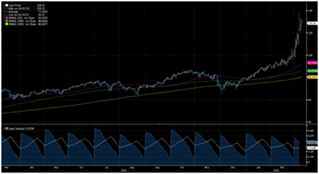 На фоне роста геополитической напряженности цены на нефть продолжают возрастать. Вечером 8 марта Президент США Джо Байден подписал указ о запрете импорта российских энергоносителей и новых инвестиций в российский энергетический сектор. Под запрет попали поставки нефти, СПГ и угля. Отказ США от энергоресурсов России может привести к значительным колебаниям на мировых рынках. Результатом уже стал скачок цен на нефть марки Brent до 138 долларов за баррель.