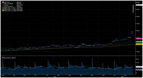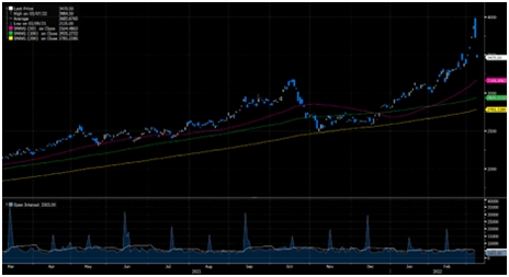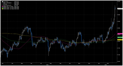 Золото достигло уровня в 2050 долларов, что близко к историческому максимуму. Основным драйвером роста стал стремительный рост инфляции и невозможность ЕЦБ и ФРС этому противостоять. Необходимо упомянуть, что риски, связанные с геополитической эскалацией, также воздействуют на рост цен на данный металл.