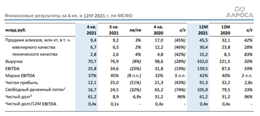 Компания “Алроса” представила отчетность по МСФО по итогам 4 кварталов 2021 года. За 2021 год выручка компании выросла на 50% до 332 млрд рублей за счет роста объемов продаж алмазов на 42% и роста индекса цен на 13%. Чистая прибыль за 2021 год составила 91,3 млрд рублей, что превышает показатель прошлого года в 2,8 раза.