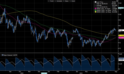 Касаемо нефти, теперь на рынке наблюдается четкое движение в сторону дефицита и рост цен (цена на нефть марки Brent составляет порядка 86–87 долларов за баррель). Россия и Саудовская Аравия продолжают снижение квот. На позапрошлой неделе стало известно, что Саудовская Аравия продлила добровольное сокращение добычи нефти на 1 млн баррелей в сутки до конца сентября 2023 года.