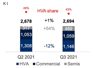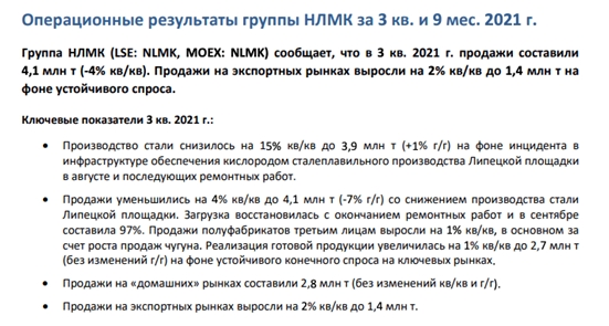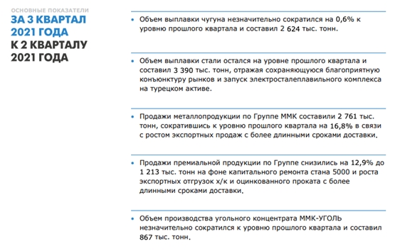 Однако, наши ожидания по отчетности “ММК” 25 октября снизились вследствие того, что продажи металлопродукции в 3 квартале составили 2 761 тыс. тонн, сократившись к уровню прошлого квартала на 16,8% в связи с ростом экспортных продаж с более длинными сроками доставки. Отсюда, оборотный капитал и EBITDA могут оказаться значительно ниже наших первоначальных ожиданий, что также отразится на дивидендной доходности. Теперь, мы ожидаем, что она составит 3 – 3,5%. Однако, возможно, данная выручка будет признана в 1 квартале 2022 года и вернет неуплаченные проценты доходности.
