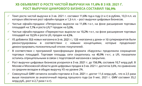 “Группа X5” представила хорошую отчетность по итогам 9 месяцев. Показатели продемонстрировали значительный рост. Чистая выручка возросла на 11,6%, в то время как рост выручки цифрового бизнеса составил 156,9%.