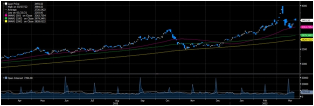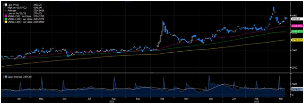 Премия за риск поставок из России снизилась на прошлой неделе, поскольку экспорт металлов продолжал расти, а некоторые заголовки указывают на прогресс в достижении деэскалации геополитического конфликта. Цены на медь, алюминий и цинк резко упали с максимумов начала марта и сейчас вернулись в пределах ~5% от уровней, существовавших до эскалации геополитической напряженности. Цены на никель резко упали в первые два дня после возобновления торгов.