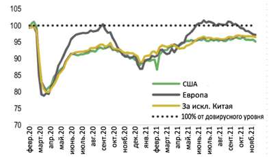 Однако, дальнейшее развитие событий зависит от распространения коронавируса и рисков, связанных с “омикроном”. Касаемо спроса, пока мы не видим признаков ослабления в глобальном масштабе. Например, мобильность в Европе и Китае снизилась в результате мер, принятых правительствами, но растет в Азии за исключением Китая и Северной и Южной Америки.