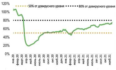 Глобальная мобильность (за исключением Китая) после резкого роста в конце этого лета - с 84 % от уровня 2019 года в июле до 91 % от уровня 2019 года в сентябре — продолжает восстанавливаться, но несколько более медленными темпами, составив в среднем 93 % от уровня 2019 года на прошлой неделе. Восстановление глобальных рейсов замедлилось во 2 полугодии 2021 года, стабилизировавшись чуть выше 70 % от уровня 2019 года с июля, но, наконец, преодолело уровень 75 % от 2019 года на этой неделе.