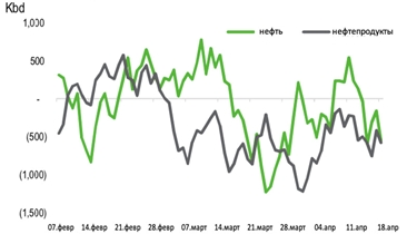 Сокращение экспорта продукции в сочетании с падением внутреннего спроса на нефть в России на 200 тыс. баррелей в сутки привело к сокращению работы российских нефтеперерабатывающих заводов. Объем сокращений переработки в апреле вырос до 1,3 млн баррелей в сутки, что почти на 0,6 млн баррелей в сутки выше среднего апрельского уровня.