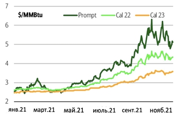 Структурный дефицит предложения, вызванный увеличением экспорта СПГ (экспорт СПГ из США в этом году вырос до новых максимумов, чему способствовало завершение строительства поезда Корпус-Кристи 3 и рекордный экспорт СПГ в Азию и Европу), в сочетании с неэластичной картиной спроса и предложения, вызвал историческое ралли, поскольку уровни хранения упали до дефицита в 235 млрд куб. футов по сравнению со средним показателем за 5 лет. В условиях все более слабых рычагов спроса и предложения, низких ожиданий в отношении запасов на конец лета и быстрого приближения зимы дополнительная премия за риск нашла свое отражение в кривой движения вперед, особенно зимой 2021 - 2022.