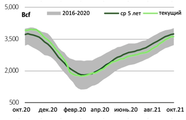 Однако, прогноз погоды имел тенденцию к потеплению этой осенью, что привело к сокращению спроса на отопление в начале сезона и увеличению объемов хранения почти на 70 млрд. куб. футов в течение сентября и октября. Это оказало существенное воздействие на ожидания относительно уровней запасов на конец лета в США, которые теперь, возможно, будут выше 3,6 трлн куб.футов, что немного ниже среднего показателя за 5 лет.