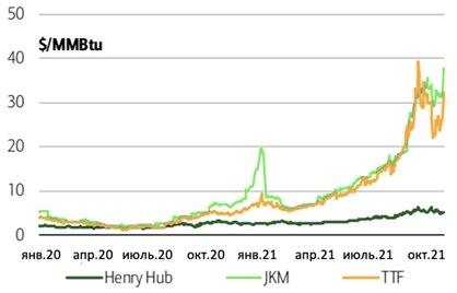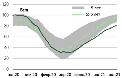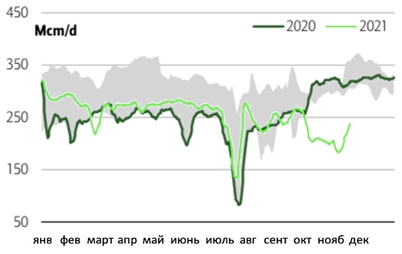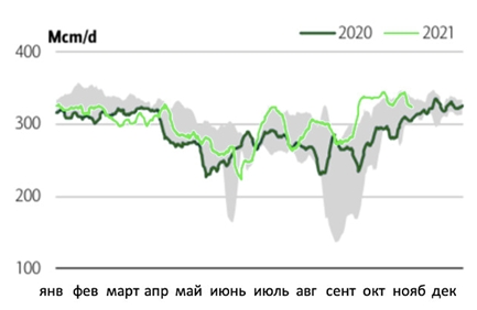 Тем временем производство в Норвегии и Великобритании выросло до максимумов 2021 года. Норвежский экспорт увеличился до 335 млн куб.м в сутки в октябре, что на ~17 % выше уровня октября 2020 года в 285 млн куб.м в сутки.