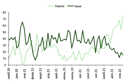 Важно отметить, что мы по-прежнему ожидаем, что заявки Азии на спотовые поставки СПГ восстановятся летом, сократив поставки европейского СПГ по сравнению с текущим периодом. В частности, мы предполагаем сокращение запасов газа в Азии после более холодного, чем в среднем, января / февраля. Также, мы ожидаем, что спрос на СПГ в Китае, вероятно, возрастет вместе с промышленной активностью после зимних Олимпийских игр, в сочетании с вероятной менее строгой политикой, связанной с пандемией коронавируса, как только погода в регионе станет теплее.