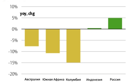 Основные страны-производители угля, изменение в годом исчислении (январь - июнь)