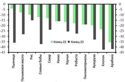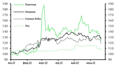 Сельскохозяйственные рынки остаются напряжёнными. Мы предполагаем, что цены на сельскохозяйственные товары снова снизятся в ближайшие месяцы, однако, большинство из них, вероятно, останутся исторически высокими из-за ограниченного предложения, опасений по поводу будущих поставок и высоких цен на энергоносители.