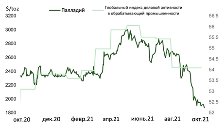 Цена на палладий и глобальный индекс деловой активности в обрабатывающей промышленности