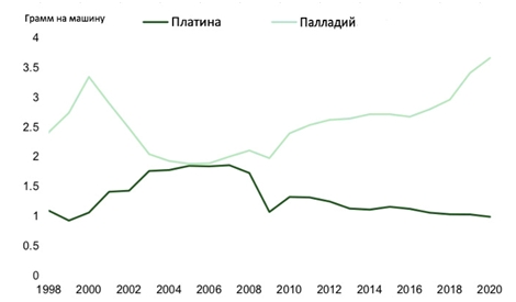 Среднее использование палладия на автомобиль существенно возросло в 2018 - 2020 годах из-за ужесточения экологических норм на нескольких крупных автомобильных рынках. Следующее серьезное ужесточение регулирования запланировано на 2025 год, а высокие цены на палладий и родий заставили автопроизводителей сосредоточиться на экономии и замене. Поэтому мы ожидаем небольшого снижения использования палладия в ближайшие годы.