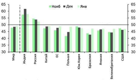 Производственный сектор глобального PMI вырос с 48,5 до 49,0 в январе. Несмотря на увеличение, это все еще оставляет его ниже отметки на уровне 50, что подразумевает сокращение объема производства в обрабатывающей промышленности. Большинство индексов в крупнейших экономиках были выше своих декабрьских уровней. Значительный рост зафиксирован в Польше, где индекс достиг 9-месячного максимума. Однако, за исключением России (52,6) и Индии (55,4), все показатели стран остаются ниже 50, что отражает замедление экономической активности.