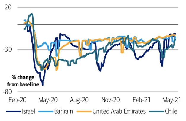 Отсюда, за некоторыми исключениями, тенденции в области мобильности улучшаются во всем мире, чему также способствует быстрый рост числа вакцинаций в США и Европе.