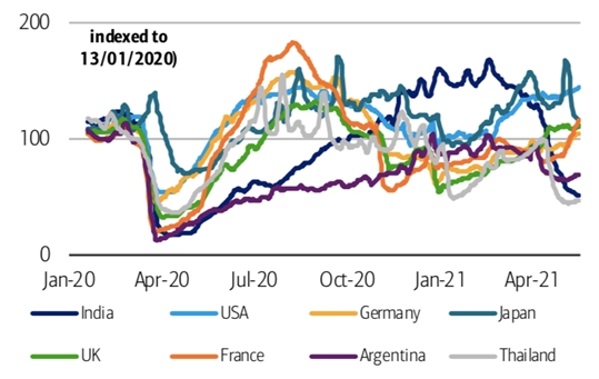Мобильность быстро растет в США и Европе по мере ускорения вакцинации и снятия блокировок, а также роста грузовой и промышленной активности. Это восстановление на самом деле значительнее, чем предполагалось, и помогает компенсировать недавний удар по спросу и вероятное более медленное восстановление в Южной Азии и Латинской Америке.