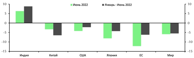Спад производства, вероятно, усилился в июне в большинстве стран с развитой экономикой, особенно в странах ЕС, где затраты на электроэнергию в июне еще больше увеличились до непомерно высоких уровней для производства стали. Более того, в июле цены на электроэнергию во многих странах ЕС продолжают расти, что не предвещает позитива для производства.