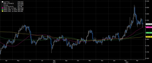 Напряженность между динамикой курса и геополитикой, вероятно, сохранится для золота. Хотя, учитывая, что мартовское решение ФРС уже позади, а следующее заседание ФРС состоится не раньше начала мая, фундаментальные показатели ставки/ ФРС США могут снизиться в значимости в ближайшие недели из-за изменений в геополитике вокруг ситуации между Россией и Украиной и, как следствие, изменений в ценах на сырьевые товары, что в конечном итоге может определить траекторию цен на золото в следующем месяце.
