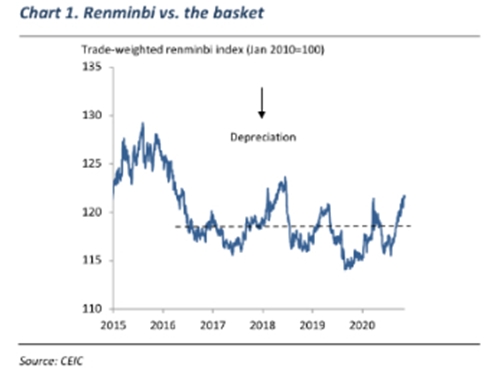 Как показано на рисунке, юань укрепился по отношению к корзине валют в течение последних двух кварталов, но не так сильно, сейчас он котируется примерно на 2% выше среднего уровня за 5 лет, что не выходит за пределы "нормального" диапазона колебаний за последние полдесятилетия.