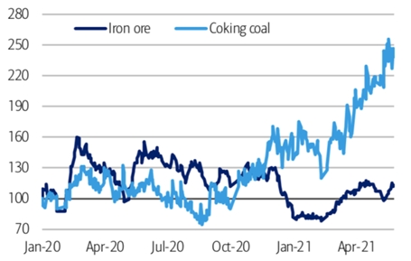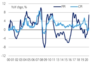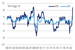 Рост цен на сырьевые товары вслед за пандемией COVID-19 все больше подпитывает инфляцию. Несмотря на то, что власти Китая стали все чаще выражать свою обеспокоенность по поводу котировок сырья, часто указывая на спекуляцию и избыточную ликвидность, мы сомневаемся, что правительство сможет стимулировать оптовую торговлю сырьевыми товарами на устойчивой основе.