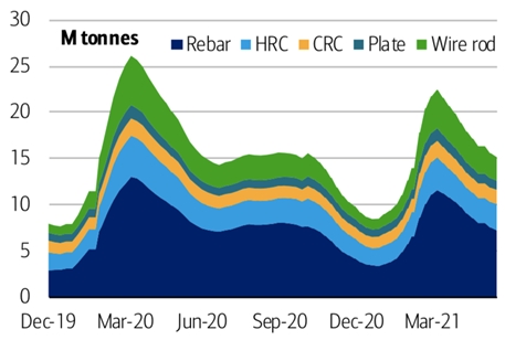 В случае стали и алюминия, производства столкнулись с постоянным превышением мощности/низкой рентабельностью, а также с высоким выбросом CO2. Производство стали в Китае выросло на 15,8% в годовом исчислении и на 13,4% в апреле. Несмотря на эти показатели и свидетельство сохраняющегося высокого спроса, запасы сократились, что свидетельствует о том, что внутренний рынок стали был в напряженном состоянии.