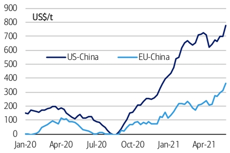 Это произошло вследствие того, что за пределами Китая участие инвесторов ограничено, а на рынках преобладают физические транзакции между коммерческими операторами. Конечно, на рост здесь сильно повлияли фискальные и монетарные стимулы. Однако, если же цены на сталь в Китае объявляются сталелитейными заводами и правительство добилось и, вероятно, добьется успеха в снижении внутренних цен, оказывая на них давление, то алюминий, как правило, является менее региональным и более глобальным рынком, отсюда может быть труднее снизить цены на устойчивой основе. Цены на алюминий также повышаются за пределами Китая по целому ряду причин, включая энергетический переход. На наш взгляд, замедление спроса наряду с ослаблением лимита мощностей Китая в 45 млн тонн было бы возможным способом снижения цены.