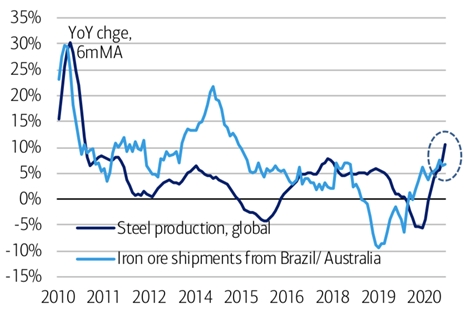 Возвращаясь к теме стали и коррелируя различия между мировым производством стали (спрос) и поставками железной руды из Бразилии/Австралии (предложение) с ценами на железную руду, мы подчеркиваем, что эти два показателя имеют тенденцию в одном направлении. Таким образом, мы считаем, что существуют ограничения относительно того, насколько цены на железную руду могут снизиться в соответствии с официальными мерами.