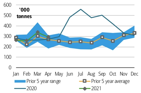 Импорт меди значительно вырос во 2 полугодии 2020 по мере восстановления активности. К этому моменту, по нашим оценкам, базовое потребление увеличилось на 20% в течение лета. Поставки несколько снизились в последние месяцы, в том числе из-за того, что покупатели неохотно платили повышенные цены.