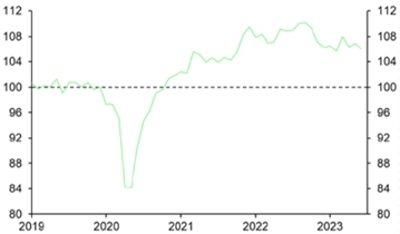 В Китае недавнее ослабление торговли в основном было вызвано слабым внутренним спросом, в результате чего импорт сократился на 5,3% м/м в июле, согласно официальным таможенным данным. Это произошло, несмотря на резкий рост импорта полупроводникового оборудования из Японии и Нидерландов в преддверии введения обеими странами ограничений на импорт составляющих производства микросхем. Несмотря на то, что данное снижение вряд ли окажет серьезное влияние на мировую торговлю, учитывая, что на эти компоненты приходится лишь небольшая доля от общего объема торговли, но это, вероятно, все равно окажет значительное влияние на долгосрочные перспективы роста Китая. Между тем, хотя экспорт из Китая сократился не так сильно, как импорт, мы ожидаем дальнейшего снижения экспорта в ближайшие месяцы. Фактически, другие показатели экспортных заказов, такие как продажи промышленной продукции на экспорт, были намного слабее, чем то, что было отражено в таможенных данных за последние месяцы. И хотя высокий спрос на электромобили китайского производства стал существенной опорой экспорта товаров за прошедший год, спрос на другие товары, такие как электроника, продолжал ослабевать по мере того, как структура расходов после пандемии нормализовалась, переходя от товаров к услугам.