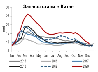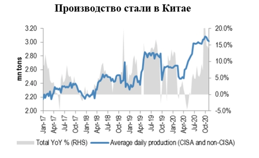Следовательно, мы можем предположить, что строительный сектор и связанные с ним посредники запасаются материалами в рамках подготовки к надвигающемуся буму активности, который может быть обусловленного политикой стимулирования. На наш взгляд, вероятность большого стимула не столь очевидна, т к после недавней Центральной Экономической Конференции (Central Economic Work Conference), которая проходила завершилась 18 декабря, Народный банк Китая сигнализировал скорее об аккуратном сокращении политики стимулирования и даже вероятном повышении процентных ставок, которые по оценкам аналитиков могут вырасти на 30 bp в 2021 году. Таким образом, завышенные ожидания могут не оправдаться, и мы рекомендуем следить за динамикой кредитования и темпами роста нового строительства в Китае в ближайшие 6-12 месяцев как главными индикаторами экономической активности в стране.