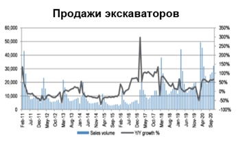 Как следует из статистики, при росте общего в месяцы активного роста промпроизводства в Китае этой осенью темпами около 6% в годовом выражении, темпы производства стали росли вдвое быстрее - на 13-14%, после нескольких лет относительной стагнации. А продажи строительного оборудования росли еще более впечатляющими темпами. Например, за 11 месяцев было продано на 37% больше экскаваторов, чем годом ранее (в ноябре этот рост составил +67%).