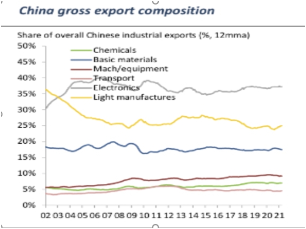 На графике ниже показана динамика структуры экспорта Китая по отраслям с начала 2000х. Здесь отчетливо видно падение доли легкой промышленности до, примерно 2009 года, и опережение ( и выход на первое место) доли электроники. Однако с тех пор тренд далеко не столь очевиден.