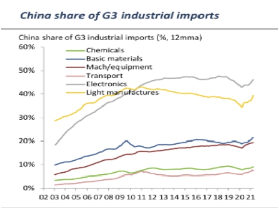 Похожие результаты дает рассмотрение структуры импорта китайских товаров крупнейшими экономиками (CША, ЕС, Япония): с 2018 года увеличение экспорта электроники по сравнению с легкой промышленностью остановилось, и даже наблюдается разворот. Медленно, но верно растут доли экспорта материалов, химической промышленности и транспорта.