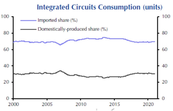 Что же касается планов и амбиций, транслируемых КПК – их, конечно важно учитывать, но надо понимать_ что технологический прогресс сложнее планировать «сверху», чем строительство инфраструктуры. Так, не смотря на огромные инвестиции, и амбициозные планы, Китай никак все еще не смог уменьшить долю импортируемых микросхем: