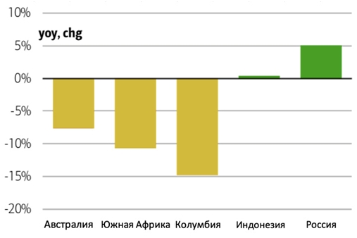 Более того, в других крупных странах-производителях угля на данный момент ситуация также не выглядит оптимистичной: добыча в Колумбии снизилась на 8% г/г в августе (так как на производство Cerrejon повлияли железнодорожные блокады, в то время как закрытие Prodeco и CNR привело к сокращению объемов), поставки в Южную Африку сократились на 11% г/г (из-за планового технического обслуживания, схода поездов с рельсов и гражданских беспорядков), а производство в Австралии сократилось почти на 3% в июле.