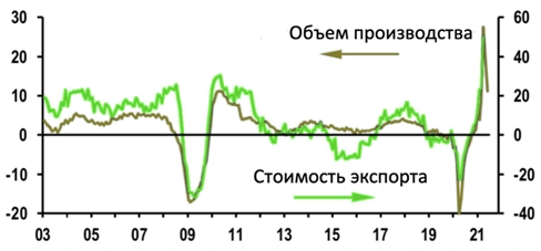 Такая же ситуация наблюдалась с экспортом товаров, который снизился в начале 2020 года и затем резко восстановился. В апреле 2021 года стоимость мирового экспорта выросла на 50% по сравнению с прошлым годом.