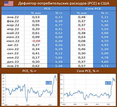 Вышедшая статистика показывает, что в январе продолжавшееся до этого сокращение PCE остановилось, показатель вырос до 0.62% мм / 5.38% гг (декабрь: 0.2% мм/ 5.29% гг), а базовый индекс составил 0.57% мм / 4.71% гг (декабрь: 0.37% мм/ 4.6% гг).