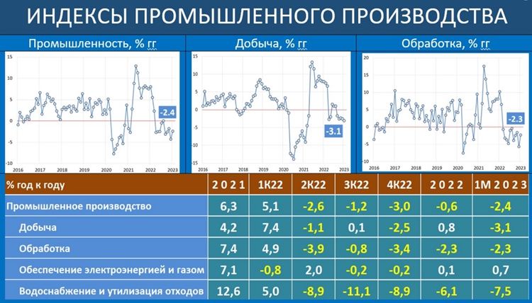 В добыче сохраняется негативная динамика, отрицательные годичные темпы присутствуют в угле (-3.5% гг), нефтегазе (-3.2% гг), металлических рудах (-3.1% гг)