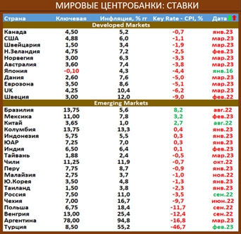 В то же время инфляция увеличивается в Канаде, EU, Дании, Норвегии, Австралии, Колумбии, Индонезии, Индии, Чили, Малайзии. По-прежнему достаточно высокие темпы роста цен в Восточной Европе: Венгрии, Польше и Чехии. Турция и Аргентина – отдельные истории…