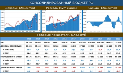 Минфин опубликовал обновленные ряды по консолидированному бюджету заканчиваются декабрём 2022г). Консолидированный бюджет – это Фед.бюджет и свод консолидированных бюджетов субъектов РФ (без учета межбюджетных трансфертов между ними). Оценивая бюджетный импульс, аналитики чаще смотрят на федеральный бюджет (связано с тем, что данные по консолидированному бюджету публикуются с большим лагом, а самостоятельно прогнозировать и оценивать его весьма сложно). Но правильней, конечно, смотреть на консолидированный бюджет.