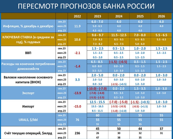 Что изменилось? Если смотреть на реальные показатели, то немного – сильно понижен экспорт, а импорт - незначительно. Сокращение внешнего спроса компенсируется внутренним – повышен прогноз по расходам домохозяйств. В итоге прогноз ВВП – без изменений – 1.5-2.5%, но более слабый рост в 2024г – цена жёсткой ДКП Инфляция чуть выше: 6-7%, но далее – без изменений – 4%. Ценовая стабильность обеспечивается намного более высоким уровнем ставки: 11.5-12.5% в 2024г. Прогноз ставки на этот год – 9.6-9.7% – означает, что её могут ещё раз поднять до 14%. Сигнал – «будем оценивать целесообразность» – это вероятность повышения 50/50 в октябре.