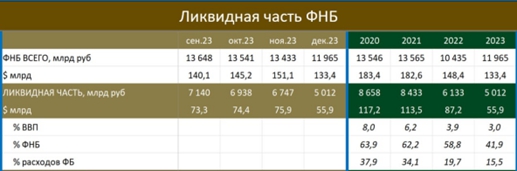 По данным Минфина, ликвидная часть ФНБ на конец 2023г - 5.0 трлн руб ($55.9 млрд).