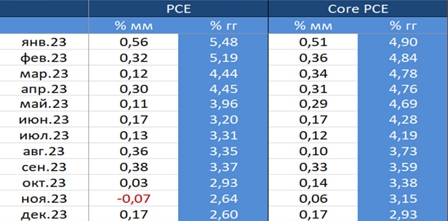 Вышедшая статистика BEA показывает, что в декабре динамика PCE составила 0.17% мм/2.6% гг (ноябрь: -0.07% мм/2.64% гг), ждали 2.6% гг, а базовый индекс: 0.17% мм/2.92% гг (ранее: 0.06% мм/3.15% гг), прогноз: 3.0% гг.