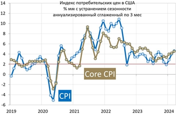 Текущие темпы роста цен на уровне базовой инфляции приближались к цели (2%) в середине прошлого года, но так и не смогли закрепиться на этом уровне. Во 2П23 темпы роста цен стали потихоньку ускоряться и к текущему моменту вышли на совсем неприличные для США 4-4.5% mm saar.