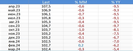 Рассчитываемый Conference Board индекс опережающих индикаторов США (LEI) снизился в марте до 102.4 vs 102.7 пунктов ранее, это -0.3% мм и -5.4% гг vs 0.2% мм и -6.2% гг до этого. Февральский рост в моменте оказался единовременным явлениям