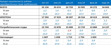 Сейчас динамика потребкредитования приобретает нездоровый характер. Сейчас говорим, что картина выглядит уже совсем неприлично. Рост потребкредита за месяц: 277 млрд (+2.0%), за 1К24: 528 млрд (+3.9%). В 1К23 было 297 млрд (+2.5%) – кредитный импульса с этой стороны вырос в 1.8 раза.