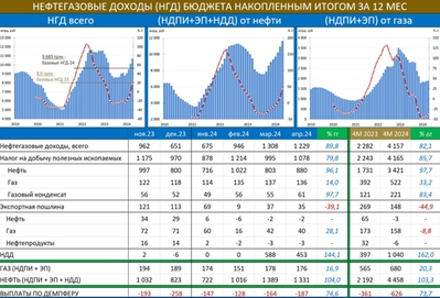 По данным Минфина, НГД в апреле – 1 229 млрд (+90% гг). За 4М24 НГД – 4 157 млрд (82% гг). Рост НГД примерно сопоставим с ростом рублевой цены барреля нефти.