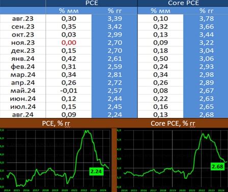 Вышедшая статистика BEA показывает, что в августе темпы PCE составили 0.09% мм/2.24% гг (ранее: 0.15% мм/2.45% гг), ждали 0.2% мм и 2.3% гг, а базовый индекс: 0.13% мм/2.68% гг (ранее: 0.16% мм/2.65% гг), прогноз: 0.2% мм и 2.7% гг.