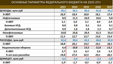 • Расходы на национальную оборону увеличены на 2.7 трлн – с 5.5 до 6.3% ВВП. В общей структуре расходов на оборону в 2025г придётся 32.5%